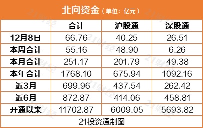 北向资金全天单边净流入,合计净流入66.76亿元。其中,沪股通净流入40.25亿元,深股通净流入26.51亿元。