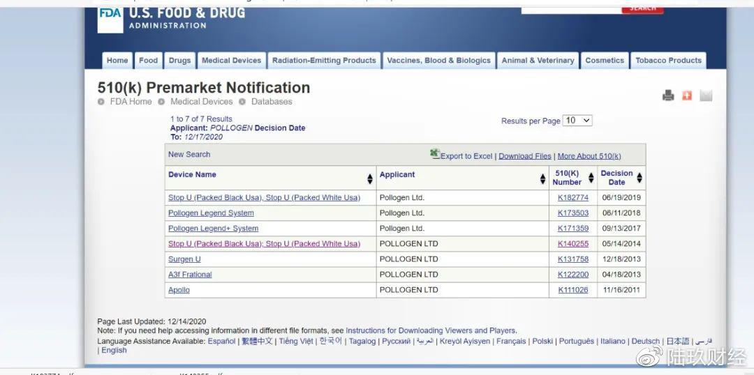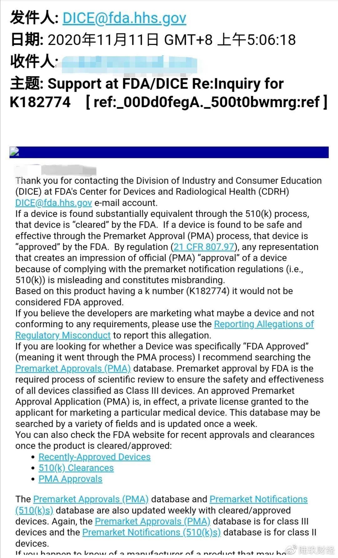 但对于K182774这个编号,陆玖财经给FDA发送邮件后,FDA的官方回复是:Based on this product having a K number (K182774) it would not be considerd FDA approved.(基于本产品的K编号(K182774),它不被视为FDA批准。)也就是说这串编码只属于产品报备,任何产品上市前都需要填写表格,都可以获得此报备编码,而这并不属于FDA认证。那么TriPollar声称“旗下产品拥有权威机构FDA 13项技术认证”到底是什么意思?陆玖财经,不敢下结论,各位看官自己判断。
