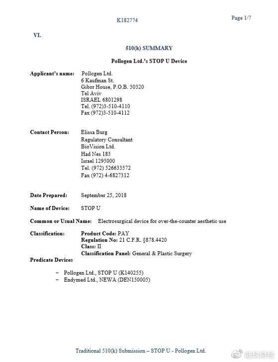 在天猫旗舰店提供的图片中,我们可以看到最下方是“Traditional 510(k) Submission—STOP U—Pollogen Ltd”字样,看起来非常专业,但事实上Submission只是备案,不是认证。这仅仅是STOP U这款产品在FDA官网上提交的资料,告诉FDA这款产品要上市了,但没有得到“认证”。至于传统的510K,更是没有多权威。