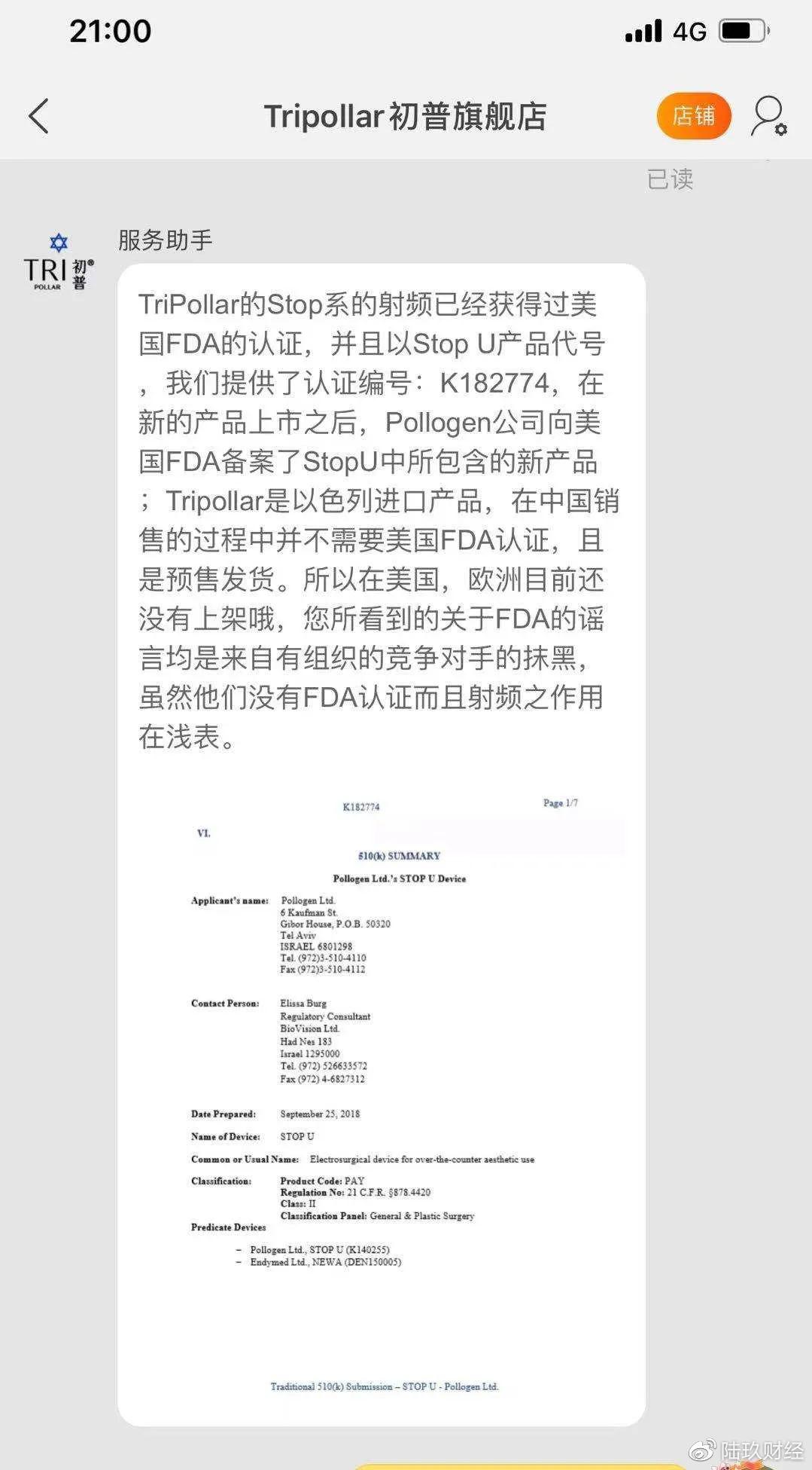 TriPollar所在的母公司POLLOGEN的FDA情况,可以看到仅有1款家用仪器在备案,该产品为Stop U,编号为K182774。通过咨询TriPollar初普天猫旗舰店的客服,可以得知目前在售的Stop Eye和Stop Vx均属于Stop U系列。