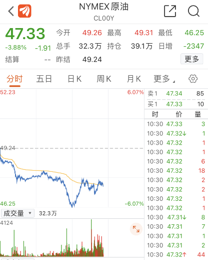 就连国际油价也未能幸免。截至发稿,NYMEX原油跌3.88%,报47.33美元/桶;布伦特原油当月连续跌3.56%,报50.40美元/桶。