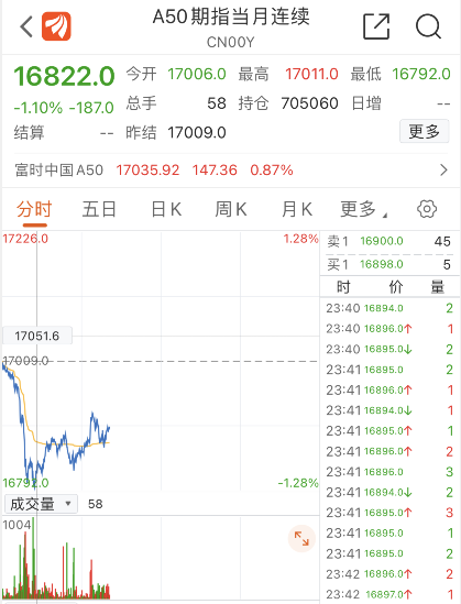 值得关注的是,A50期指当月连续开盘后最大跌1.28%,随后有所拉回,现跌1.1%。