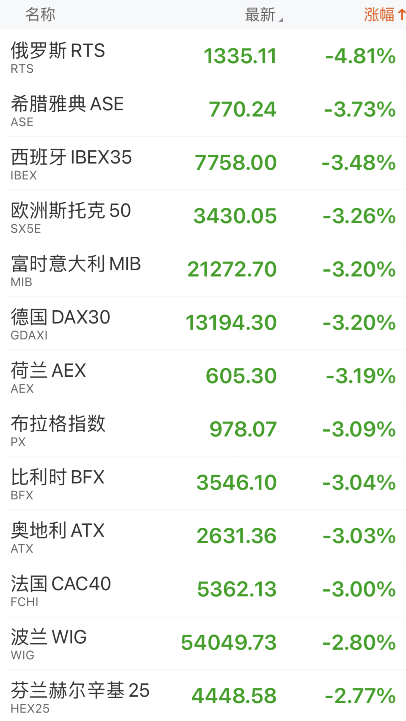 此外,欧洲股市也全线下跌。俄罗斯RTS跌4.81%,希腊雅典ASE跌3.73%,西班牙IBEX35跌3.48%,欧洲斯托克50跌3.26%,英国富时100跌1.91%。