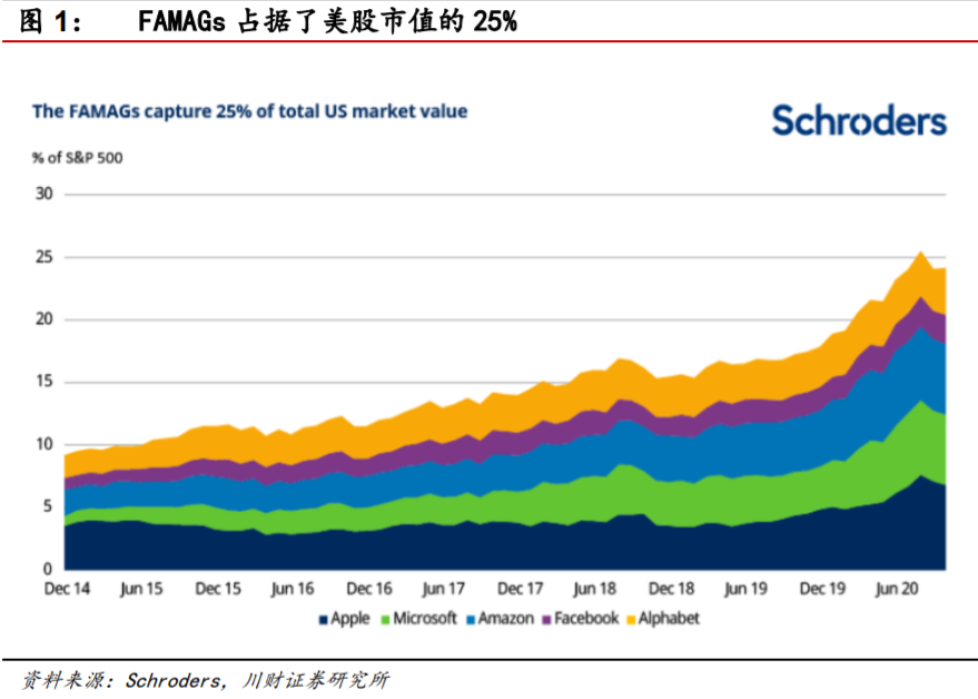 据川财证券,海外机构Schroders的Alex Tedder 认为2021年,全球股市可能继续表现良好。全球股票并不便宜,但他们的估值仍处于合理区间。与过去的12个月相比,预计市场复苏的范围将扩大到更广阔的行业。2020年,市场前期的反弹由范围相当狭窄的科技股主导,特别是亚马逊、苹果、微软、Facebook和Alphabet(有时也被称为FAMAGs)。