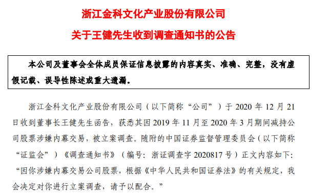 金科文化(300459)12月21日晚公告,公司董事长王健因2019年11月至2020年3月期间减持公司股票涉嫌内幕交易,被立案调查。