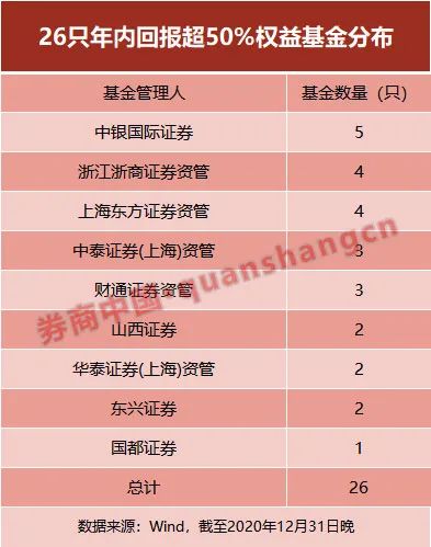 若将范围拉大到全部26只2020年内回报率50%以上的权益基金,则中银国际最多共有5只,其次是东证资管、浙商资管各4只,财通资管、中泰资管各3只,山西证券、华泰资管和东兴证券各2只,国都证券1只。