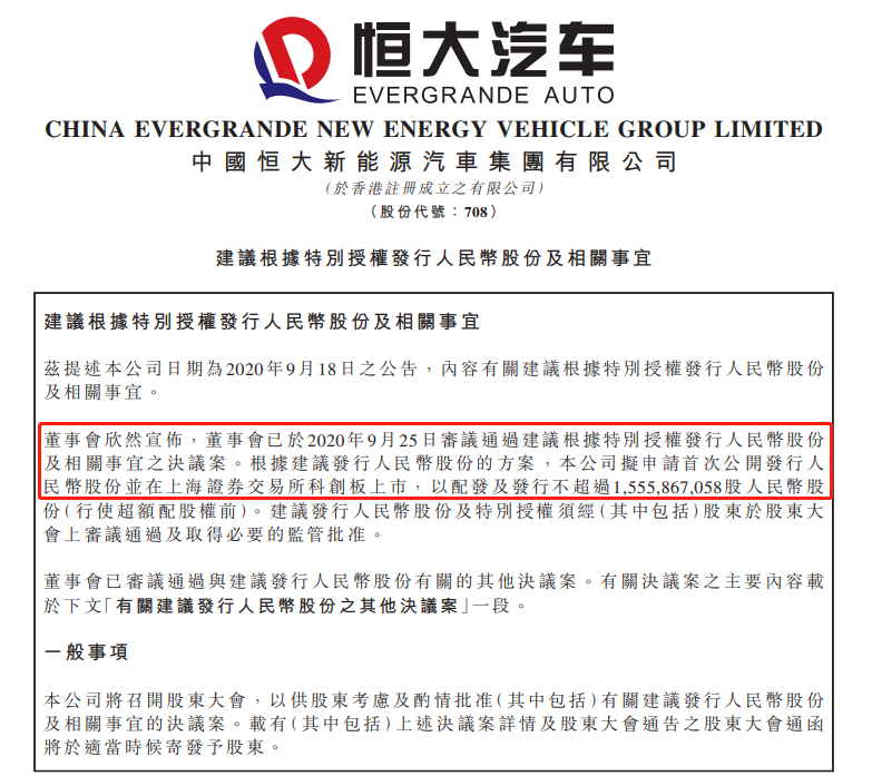 值得一提的是,2020年9月25日,恒大汽车曾公告,董事会审议通过恒大汽车发行人民币股份相关事宜议案,建议发行不超过15.56亿股人民币股份(行使超额配股权前),发售价不低于每股25港元,募集资金拟用于新能源汽车研发、生产及营销网络建设项目和补充营运资金。