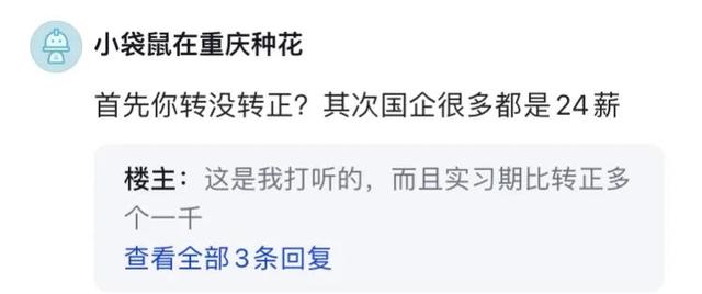 有网友建议说,首先你转没转正?其次国企很多都是24薪