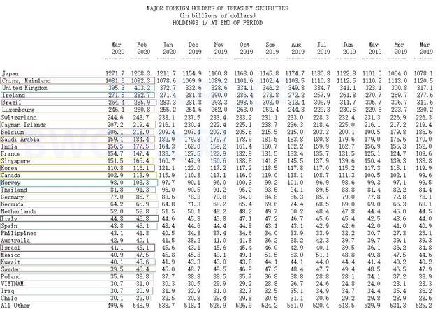 事情的另一面,由于美元信用的持续减弱,在美联储或都不再看好美国经济的同时,全球越来越多的央行已提前掀起了减持美债潮。根据美国财政部最近一次公布的国际资本流动报告TIC(美债数据延后两个月惯例,仅体现了主要持有者名单),全球至少28国的央行或货币当局在3月大幅共减持了2993亿美元的美国国债。其中包括中国、俄罗斯、英国、爱尔兰、巴西、卢森堡、开曼群岛、比利时、沙特、印度、新加坡、韩国、加拿大、挪威、泰国、德国、百慕大、荷兰、意大利、西班牙、以色列、墨西哥、科威特、瑞典、波兰、越南、伊拉克、智利等。