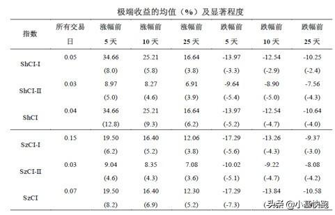 上面这张表统计了上证指数(ShCI)和深证成指(SzCI)上市以来截止2010年1月29日,所有交易日、涨/跌幅最大的前5天、前10天、前25 天的平均日收益率。括号里的数值表示该最好(最差)收益率偏离整体益率均值的标准差。