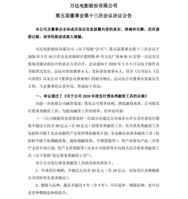 3月10日16点15分,A股上市影企万达电影发布公告称“公司根据资金需要适时一次或分次通过公开或非公开方式申请发行额 度不超过人民币 20 亿元(含 20 亿元)的债务类融资工具。”