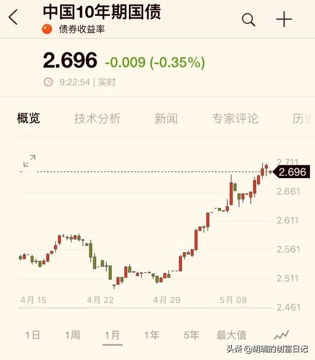 而我们的市场利率一般是参考10年期国债的收益率,我们看看它最近的走势: