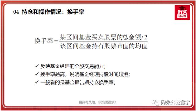 从公式能看出,基金买入卖出股票越频繁,换手率越高。这个指标反映了基金经理的个股交易能力,换手率越高,说明基金经理持股时间越短。一般我们看的是基金报告期持仓换手率,这个数据可以自己从基金定期报告中算,也可以直接在wind、同花顺等金融软件上查。