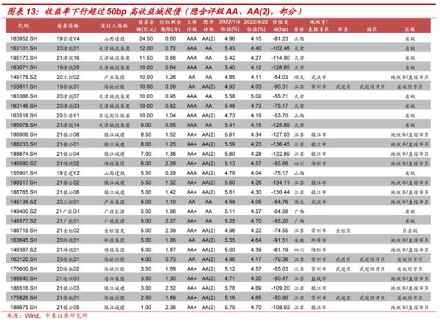 隐含评级AA级、AA(2)在高收益城投债中属于资质相对较好的个券,具体来看,在1880只高收益城投债中,隐含评级为AA、AA(2)的分别有148只、521只;其中,2022年以来收益率下行的分别有76只、334只。我们选取隐含评级在AA、AA(2)且2022年1月4日至2022年4月22日收益率下行幅度超过50bp的债券,共计142只,涉及金额909.32亿元,其中海淀国投、随州城投、邵阳城投、镇江城建等主体的部分债券下行幅度超过100bp。这些债券及对应主体今年以来信用资质、市场认可度或有一定改善,可以适当进行挖掘。