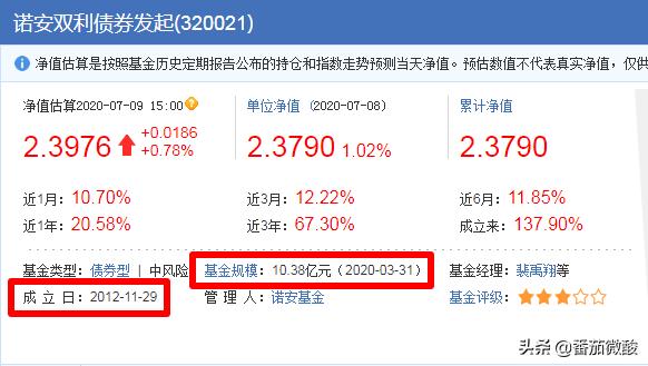 第一,成立时间。这只‘诺安双利债券发起(320021)’是我在天天基金网粗筛后排名第一的基金,今天就用它来做例子。可以看到成立时间为2012年11月,目前已经有7年多了。这里和货币基金英语,一般优先筛选成立时间在3年以上的基金。